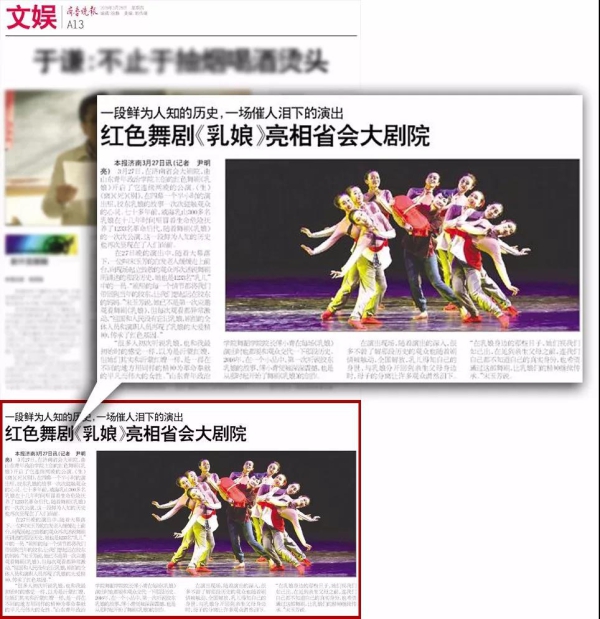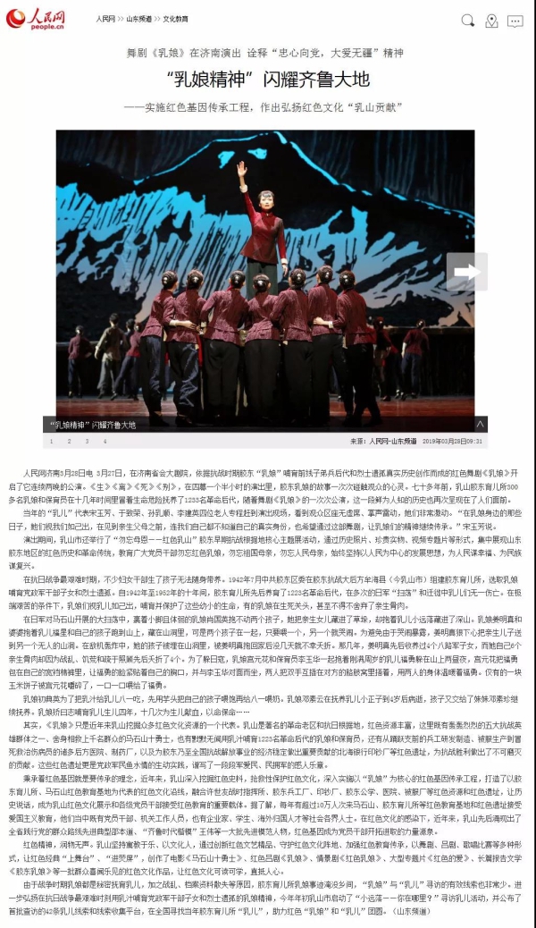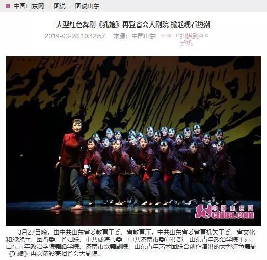作者: 编辑: 复审: 终审: 来源:党委宣传部 发布时间:2019-04-01 3月27日、28日,我校大型红色舞剧《乳娘》在进京演出归来后,再次在省会大剧院倾情上演,“乳娘”的感人事迹再一次感动齐鲁大地。连日来,新华社、人民日报、人民网、山东电视台、大众日报、大众网等广大媒体纷纷予以关注报道,引发了热烈的社会反响,赢得了广泛赞誉。 山东电视台《山东新闻联播》:红色舞剧《乳娘》:传承人间大爱 弘扬红色精神 http://v.iqilu.com/sdws/sdxwlb/2019/0328/4653888.html (点击网址播放) 山东电视台《早安山东》:舞剧《乳娘》再登山东省会大剧院 http://v.iqilu.com/sdws/zasd/2019/0328/4653691.html (点击网址播放) 山东电视台《民生直通车》:舞剧《乳娘》3月27日晚再次亮相省会大剧院 http://v.iqilu.com/ggpd/msztc1/201903/27/4653480.html (点击网址播放) 相关报道网址: 新华社:山东青年政治学院大型红色舞剧《乳娘》再登省会大剧院 http://xhpfmapi.zhongguowangshi.com/vh512/share/5907306?channel=weixin&from=groupmessage&isappinstalled=0 人民网:舞剧《乳娘》在济南演出 诠释“忠心向党,大爱无疆”精神 “乳娘精神”闪耀齐鲁大地 http://sd.people.com.cn/n2/2019/0328/c386903-32786314.html?from=timeline 人民日报(客户端):揭秘舞剧《乳娘》:用舞蹈演绎打动人心的红色故事 https://wap.peopleapp.com/article/3992984/3849083?from=groupmessage&isappinstalled=0 央广网:大型红色舞剧《乳娘》再登山东省会大剧院 http://www.cnr.cn/sd/ksd/20190328/t20190328_524559027.shtml?from=singlemessage&isappinstalled=0 大众日报:传承红色基因 再现感人瞬间 舞剧《乳娘》再登省会大剧院 http://paper.dzwww.com/dzrb/content/20190328/Articel02004MT.htm 齐鲁晚报:一段鲜为人知的历史,一场催人泪下的演出 红色舞剧《乳娘》亮相省会大剧院 http://epaper.qlwb.com.cn/qlwb/content/20190328/ArticelA13004FM.htm 中国山东网:大型红色舞剧《乳娘》再登省会大剧院 掀起观看热潮 http://photo.sdchina.com/show/4404127.html 新浪网:山东青年政治学院大型红色舞剧《乳娘》再登省会大剧院 https://sd.sina.cn/news/2019-03-28/detail-ihsxncvh6263117.d.html?from=singlemessage&isappinstalled=0 新锐大众:山东青年政治学院主创红色舞剧《乳娘》何以震撼人心? http://respub.xrdz.dzng.com/content/201903/23/c608966.html?from=groupmessage&isappinstalled=0 新锐大众:传承红色基因 再现感人瞬间 舞剧《乳娘》再登省会大剧院 http://respub.xrdz.dzng.com/pad/paper/c/201903/28/c610297.html 大众网:山东青年政治学院大型红色舞剧《乳娘》再登省会大剧院 http://edu.dzwww.com/rcjy/qzgl/201903/t20190328_18551825.htm 大众网*海报新闻:大爱无言 红色民族舞剧《乳娘》再登省会大剧院 https://hb.dzwww.com/p/1664261.html?f=Za1o0v 大众网*海报新闻:大型红色舞剧《乳娘》再登省会大剧院 https://hb.dzwww.com/p/1664657.html?f=00000v 山东省教育厅(今日头条):山东青年政治学院大型红色舞剧《乳娘》再登省会大剧院 https://www.toutiao.com/i6673250011884552718/?tt_from=weixin&utm_campaign=client_share&wxshare_count=1&from=groupmessage×tamp=1553737403&app=news_article&utm_source=weixin&isappinstalled=0&utm_medium=toutiao_ios&group_id=6673250011884552718 齐鲁壹点:红色舞剧《乳娘》|用山东舞蹈“讲述”胶东乳娘故事 https://m.ql1d.com/news/show/source/app/id/9980357.html 山东教育新闻网:山青院大型红色舞剧《乳娘》再登省会大剧院 http://www.sdjyxww.com/%E9%AB%98%E7%AD%89%E6%95%99%E8%82%B2/859.html?from=groupmessage&isappinstalled=0 今日头条:山东青年政治学院 大型红色舞剧《乳娘》再登省会大剧院 https://m.toutiaocdn.com/i6673330805495824907/?app=news_article×tamp=1553765721&group_id=6673330805495824907&tt_from=weixin&utm_source=weixin&utm_medium=toutiao_ios&utm_campaign=client_share&wxshare_count=2&pbid=6673386833806689806&from=groupmessage&isappinstalled=0 山东商报:《乳娘》进京归来再巡演 用山东舞蹈讲述一段峥嵘历史 http://fenxiang.tmtsp.com/562f0ef427f38e8c0f000386-5c9b45678ac84e69228b4568.html?from=groupmessage&isappinstalled=0 2019年4月1日