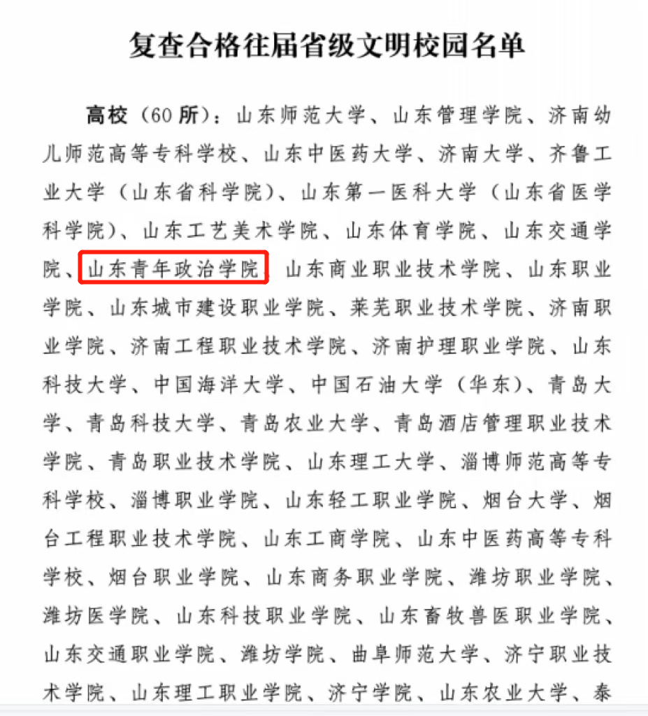 近日,山东省精神文明建设委员会印发《关于公布2022年度省级文明单位、文明村镇、文明社区和往届复查合格省级文明校园创建名单的通报》,山东青年政治学院位列其中。