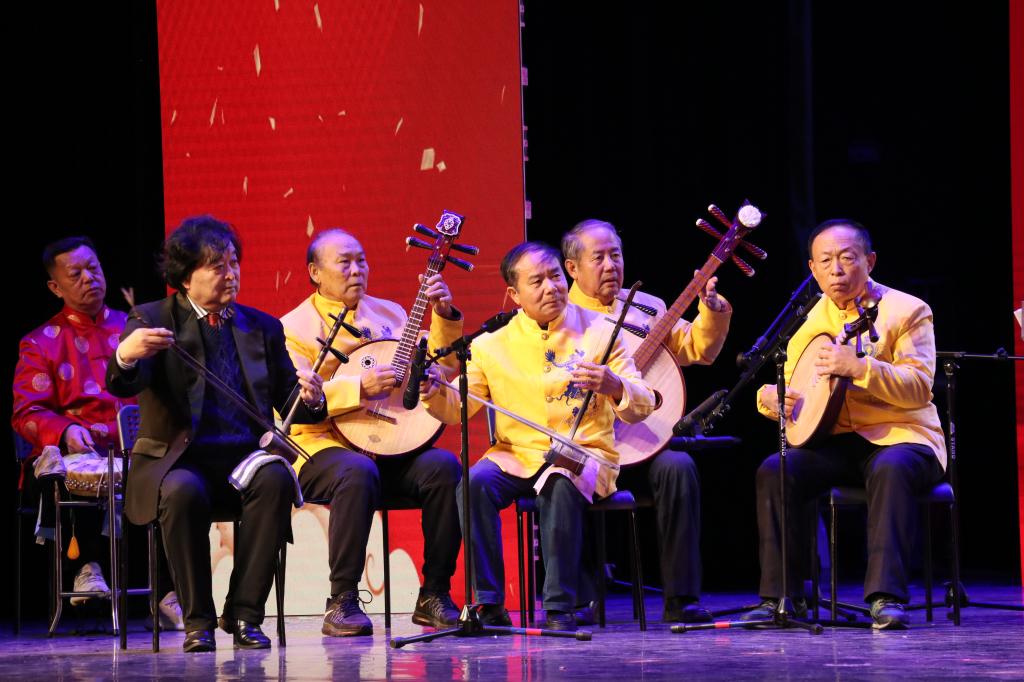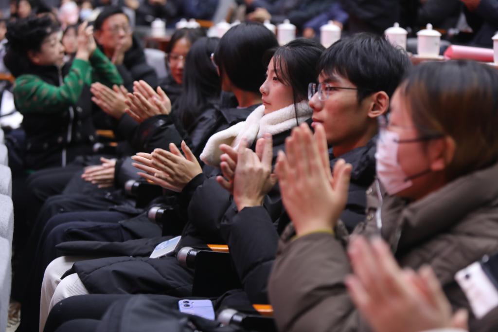 灯光暗下,鼓乐齐鸣,随着一曲器乐协奏《迎春》开场,一幕幕纵横古今时空的戏曲徐徐上演,观众掌声一阵响过一阵,喝彩声一阵高过一阵。《沙家浜·军民鱼水情》《红灯记·打渔的人》《奇袭白虎团·打败美帝野心狼》等经典现代京剧,将师生带入一段段特殊的历史场景,引人入胜、令人陶醉。传统京剧彩唱《贵妃醉酒》的精彩上演,将演出推向了高潮,引得现场掌声不断。传统京剧彩唱《关公》,卧蚕眉、丹风眼、红脸膛加上字正腔圆的唱词,将“关公”的忠义精神表现得淋漓尽致。《智取威虎山》选段胸有朝阳、打虎上山、甘洒热血写春秋选段,铿锵有力的唱腔赢得现场阵阵“叫好儿”。京歌《江山无限》、京胡独奏《夜深沉》、歌曲《我爱你中国》《江山》以及山东快书等更加深了在场师生了解和热爱中华民族悠久历史和璀璨文化的家国情怀。