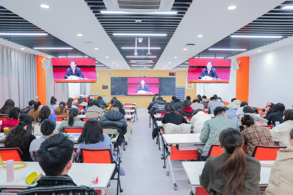 会议设主会场和分会场。校领导、科级以上干部、正高级专业技术人员、教研室负责人在主会场参会,其他教职工在分会场参会。