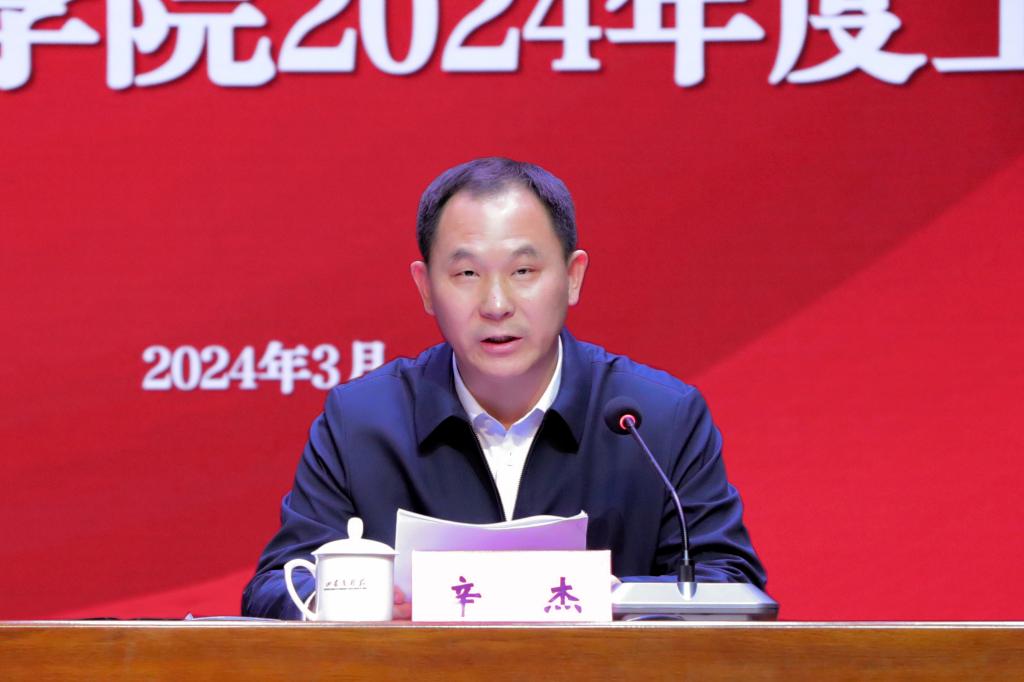 辛杰强调,2024年学校聚焦落实第四次党代会精神,深入实施“1158”发展战略,全力做好迎接审核评估工作。一是强化党建引领,以高质量党建领航事业高质量发展。要牢固树立“一融双高”工作理念,以全省党建工作示范高校培育创建为抓手,全面推动党建工作取得新成效、迈上新台阶。二是以迎接审核评估为抓手,全力提升办学质量和实力。要笃定应用型办学定位,着力推进普通本科教育和职业本科教育“一体两翼”互鉴互融、协调发展,不断深化教育教学改革,全面提升学校综合办学实力。三是强化办学条件支撑,不断提升服务保障水平。要统筹整合资源、优化配置,坚持勤俭办学理念,强化办学支撑条件,为事业高质量发展提供坚实保障。