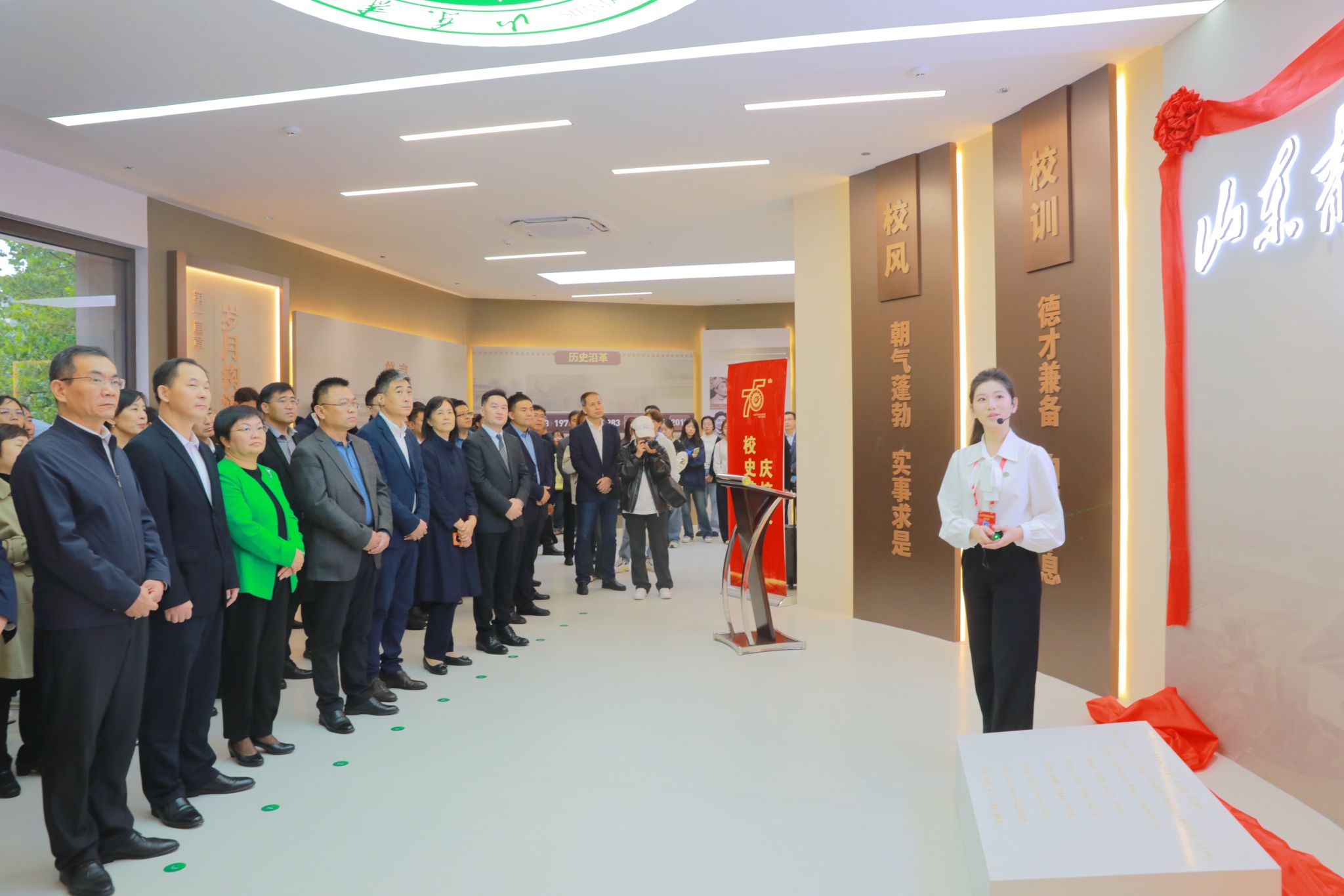 为庆祝学校建校75周年,10月18日上午10时18分,全新改造升级的学校校史馆准时开馆,迎来了首批参观观众。学校党委副书记、院长辛杰致辞,并与学校2000级装潢设计专业校友、山东星之诚生物科技有限公司董事长邵星之共同为校史馆揭牌。开馆仪式由党委副书记刘涛主持。